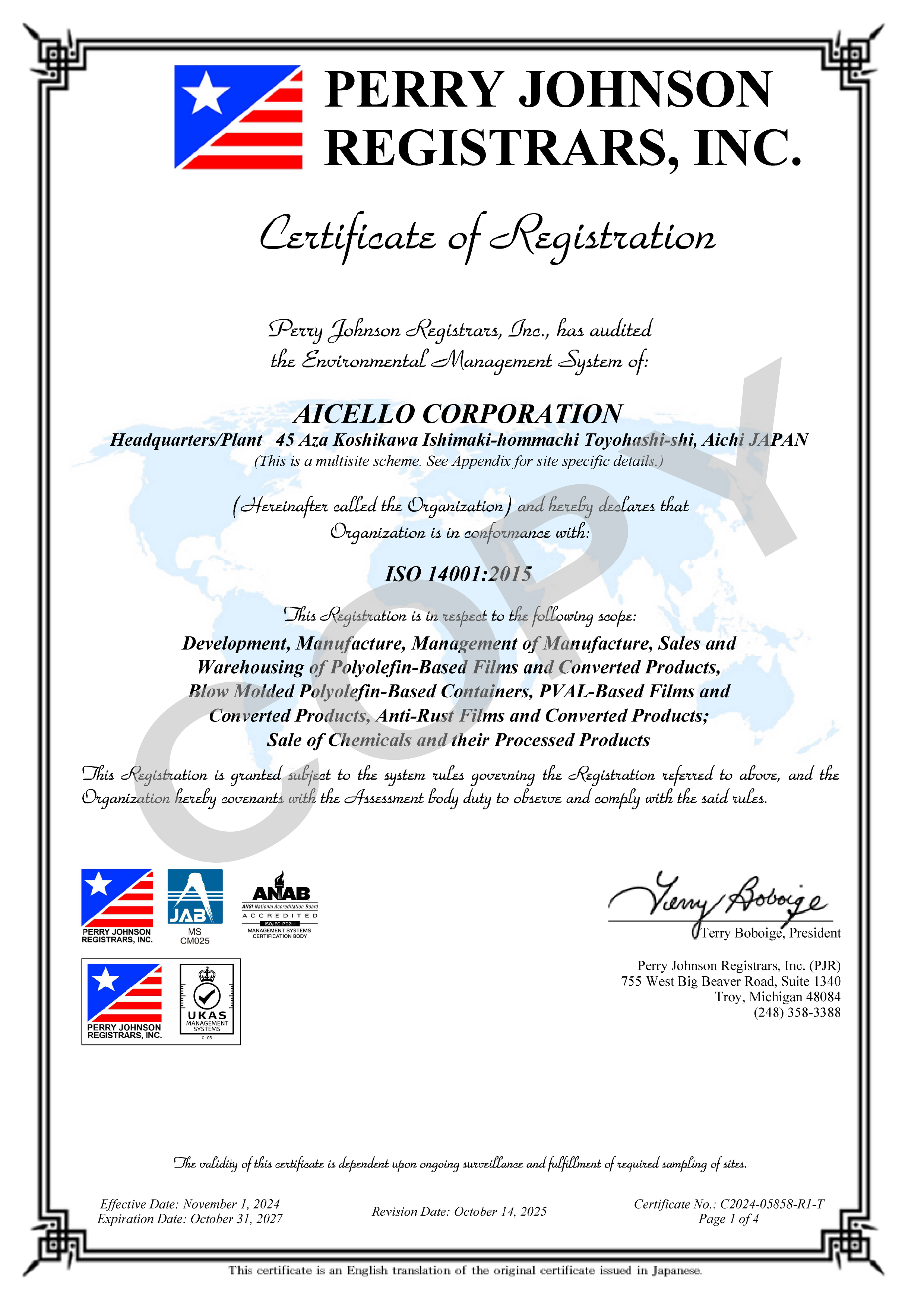 | Certificate Number | ISO9001: C2024-05857-T ISO14001: C2024-05858-T |