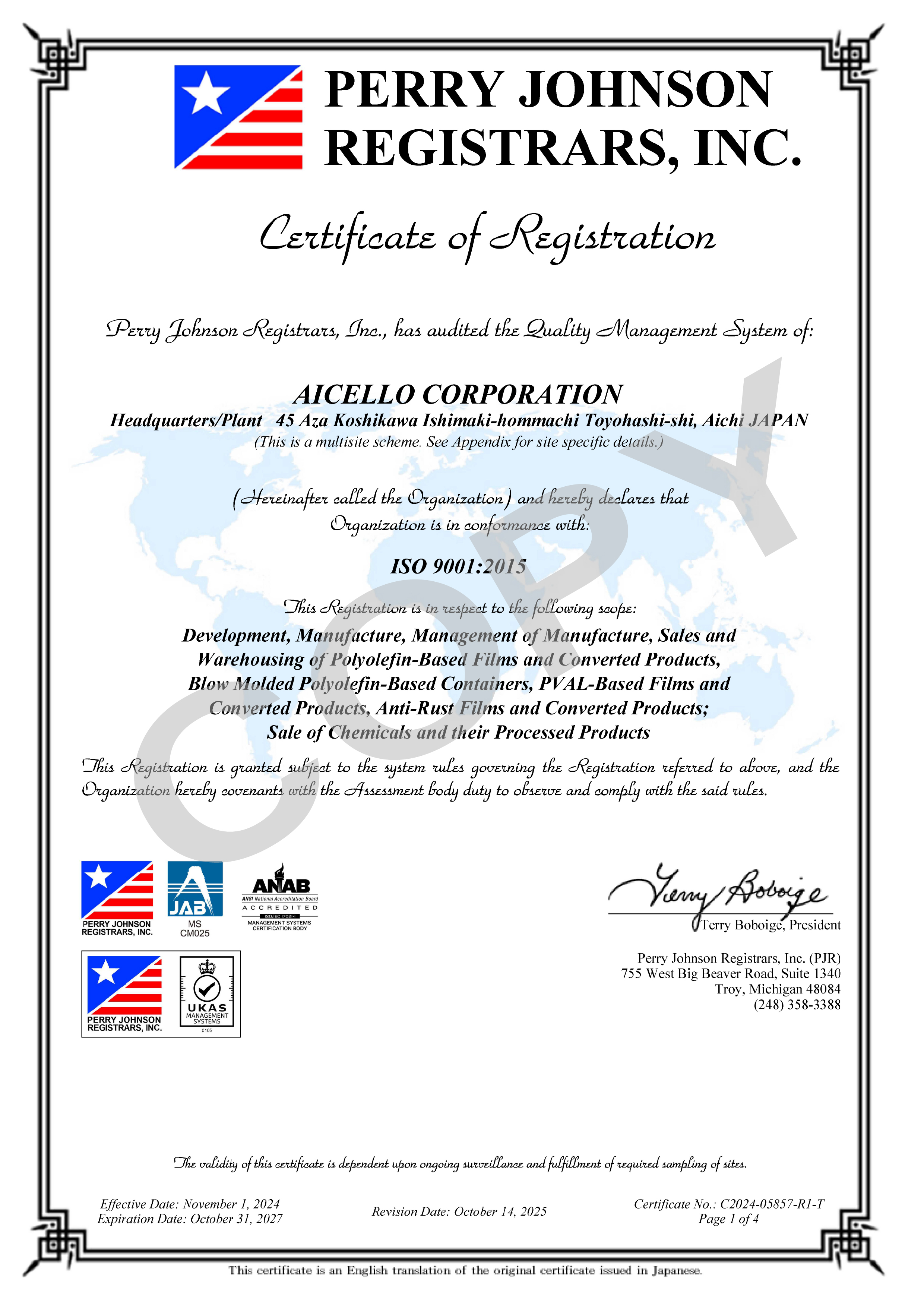 | Approval Area | Development, Manufacture, Management of Manufacture, Sales and Warehousing of Polyolefin-Based Films and Converted Products, Blow Molded Polyolefin-Based Containers, PVAL-Based Films and Converted Products, Anti-Rust Films and Converted Products; Sale of Chemicals and their Processed Products |